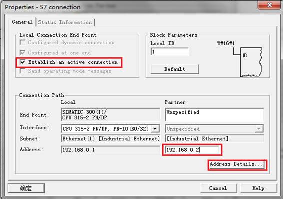 在弹出的S7 connection属性对话框中,勾选 Establish an active connection,设置Partner address:192.168.0.2(S7-200 SMART PLC IP 地址),如图8所示。